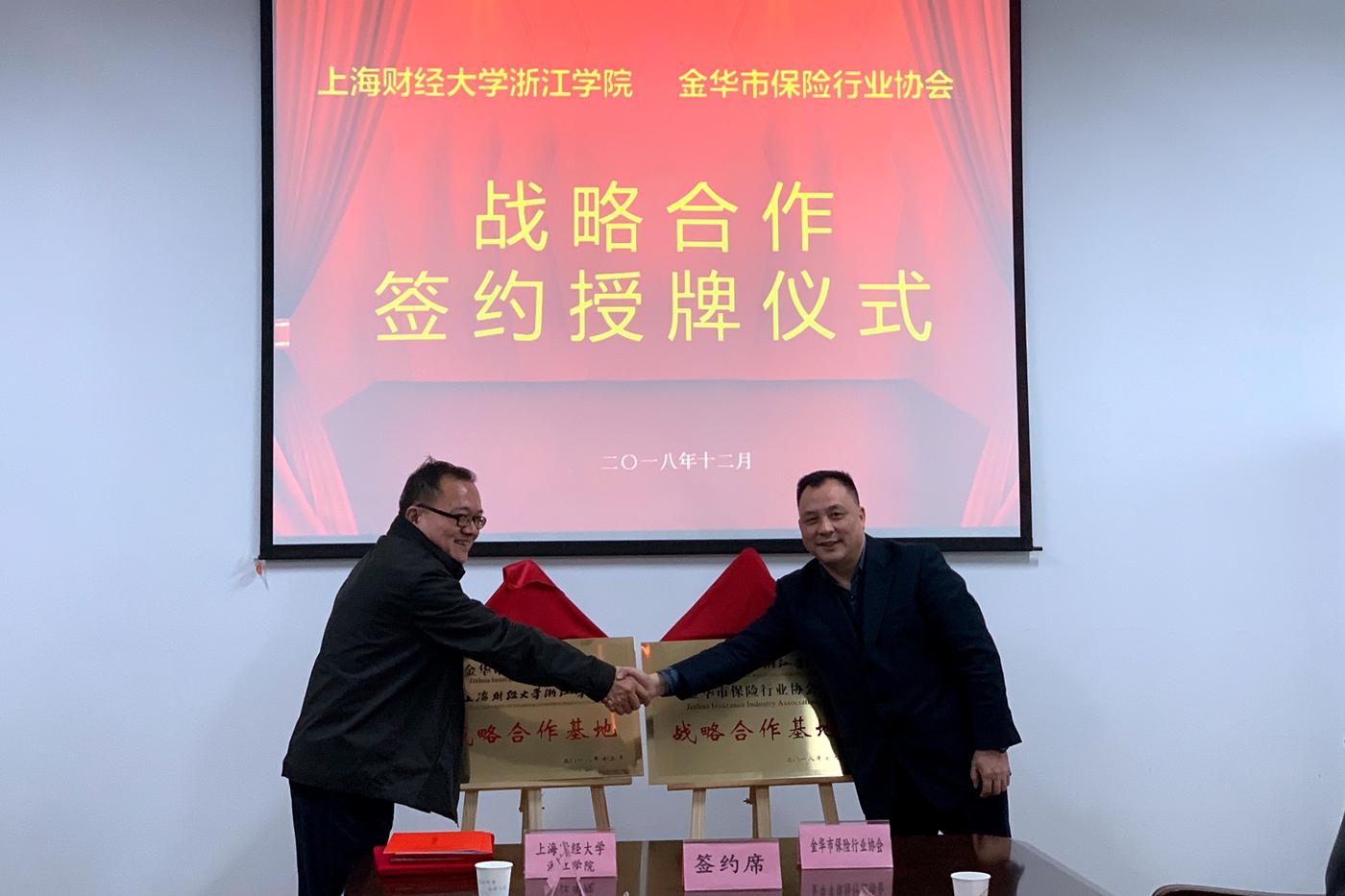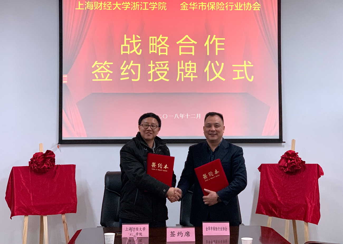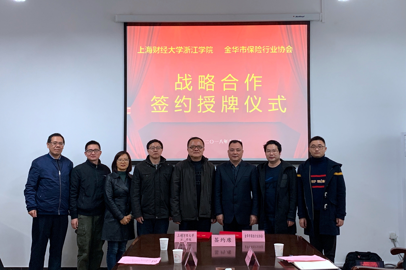 12月4日下午,学院与金华市保险行业协会举行战略合作签约授牌仪式。金华市保险行业协会秘书长沈锦东、主任周春辉、主管沈良钰,学院院长马洪、副院长邱风出席,实践教学中心主任朱艳、金融系系主任李健、教师代表张立华参加仪式。