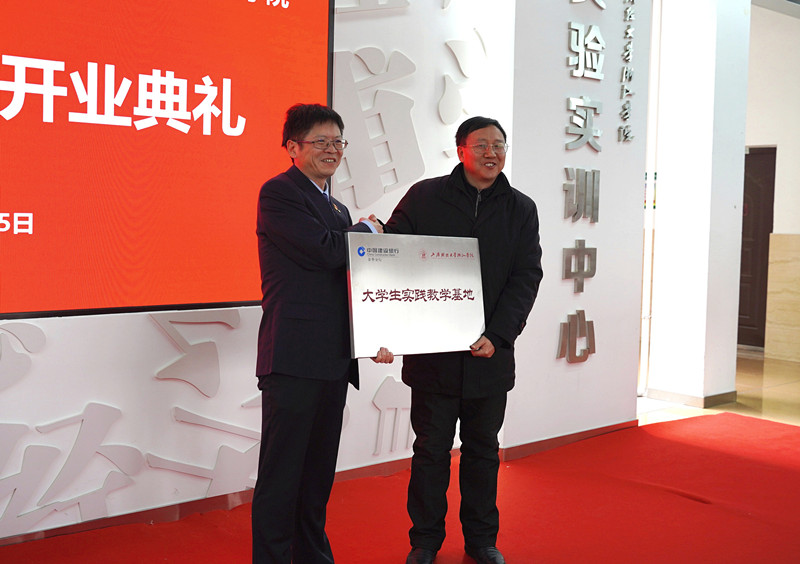 开业典礼上,上海财经大学浙江学院邱风副院长向中国建设银行金华分行卢根喜副行长授“大学生实践教学基地”牌。赵军行长为上海财经大学浙江学院“校园e银行”第一批成员颁发聘书。