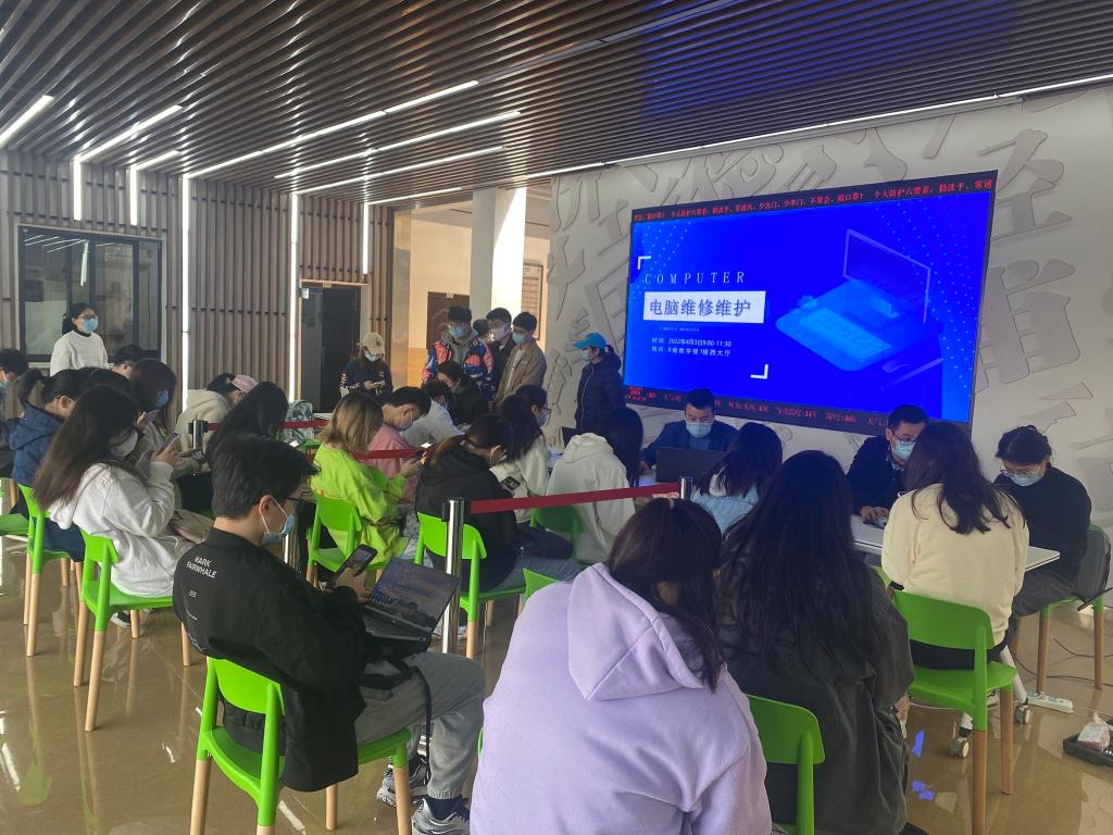 为筑牢疫情防控的坚固防线,更好地满足清明假期间在校师生的需求,4月3日,学院在实验大楼1楼西大厅开展了电脑维修维护暖心服务活动,免费为师生提供电脑操作系统安装、更新,软、硬件故障排查和常用软件维护等。