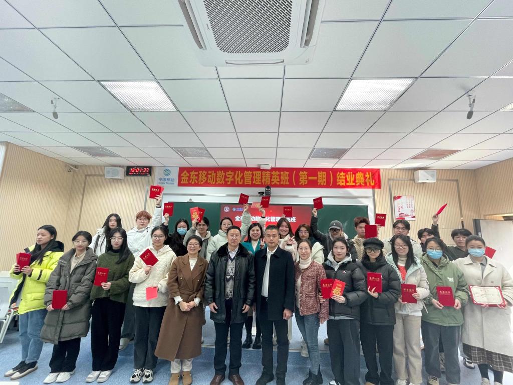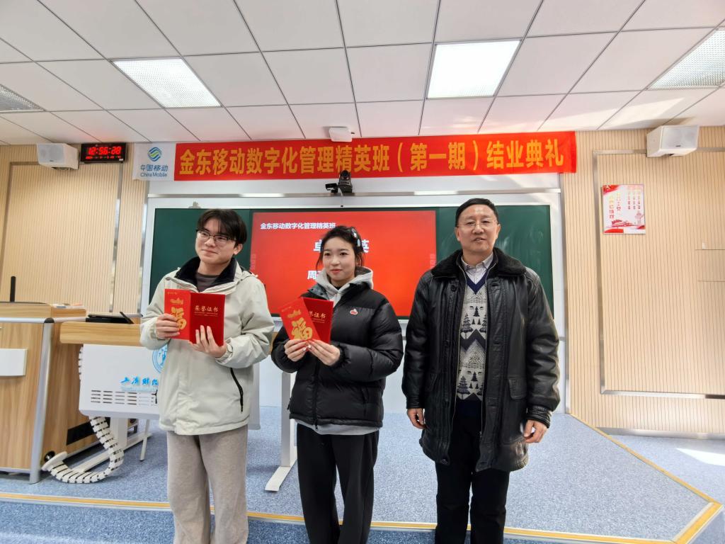 1月3日中午,金东移动数字化管理精英班结业典礼在教学楼6幢106教室顺利举行。副院长邱风,实践教学中心、校企合作处主任朱艳,中国移动通信集团浙江有限公司金东分公司总经理林金华、市场部经理于淑平和校园经理方倩,金东移动数字化管理精英班全体学员参加本次结业典礼。典礼由方倩主持。