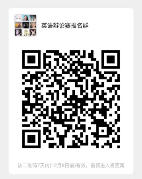 报名方式:学生自愿报名,通过扫描下方二维码进入英语辩论赛报名群报名参加: